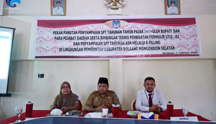 BOLSEL – Senin (03/02/2020) Sekda Marzanzius Arvan Ohy SSTP mewakili Bupati H. Iskandar Kamaru SPt membuka secara resmi Bimtek Pembuatan Formulir 1721-A2 dan Penyampaian SPT Tahunan melalui E-filing yg digelar di Kantor Bappelitbangda, Kawasan Perkantoran Panango Sekda saat menyampaikan arahan Bupati mengatakan Bimtek ini diselenggarakan salah satu tujuannya untuk mencegah kesalahan pelaksanaan kewajiban perpajakan.