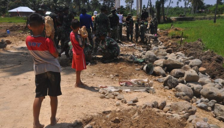 B O L S E L – Pajurit TNI selalu siap dalam membantu kesulitan masyarakat di sekitarnya. Seperti terlihat pada pelaksanaan program TMMD di Desa Mataindo Kecamatan Pinolosian Tengah Kabupaten Bolaang Mongondow Selatan.