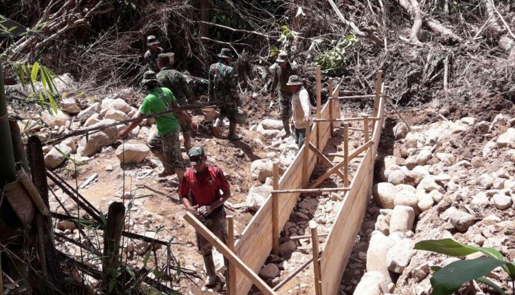 B O L S E L – Masyarakat setempat bersama Satgas TMMD Reguler ke 107 tahun 2020 di wilayah Kodim 1303/Bolmong kali ini membuat plat deker di STA 550 yang merupakan jalan baru usaha tani Desa Mataindo Kecamatan Pinolosian Tengah Kabupaten Bolaang Mongondow Selatan, Jumat (27/03/2020).