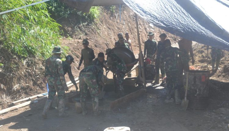 B O L S E L – Pengecoran plat deuker di STA 550 pembuatan jalan baru usaha tani Desa Mataindo dalam TMMD Reguler Ke 107 Kodim 1303/Bolmong memerlukan banyak adonan semen, koral dan pasir. Sehingga mesin aduk beton menjadi alat utama yang di butuhkan, Selasa (31/03/2020).