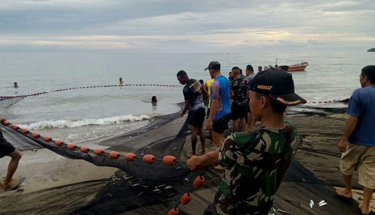 B O L S E L – Selain melaksanakan pengerjaan sasaran fisik, anggota Satgas TMMD 107 juga melaksanakan sasaran non fisik seperti membantu nelayan menarik jaring pukat dari kapal yang baru menepi ke darat, bertempat di tepian laut Desa Mataindo Kecamatan Pinolosian Tengah Kabupaten Bolaang Mongondow Selatan, Jumat (03/04/2020).