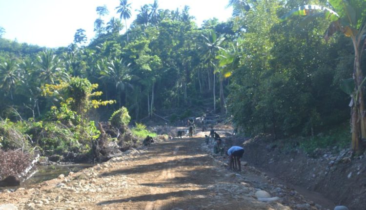 B O L S E L – Wujud kemanunggalan TNI bersama Rakyat dibuktikan dalam TMMD 107 di Desa Mataindo Kecamatan Pinolosian Tengah Kabupaten Bolaang Mongondow Selatan, Jumat (10/04/2020).
