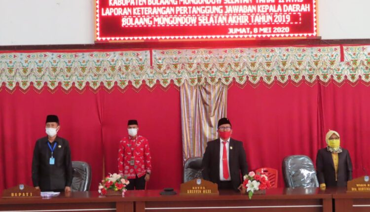 BOLSEL – Bupati Bolaang Mongondow Selatan (Bolsel) Hi. Iskandar Kamaru, Jum’at (8/5/2020) menghadiri Paripurna Tahap II Laporan Keterangan Pertanggung Jawaban (LKPJ) kepala Daerah Tahun 2019 di gedung DPRD Bolsel.