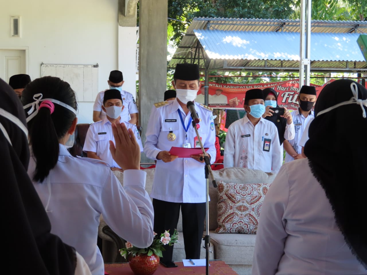Bupati mengucapkan selamat kepada para CPNS yang beralih status menjadi PNS di lingkungan Pemkab Bolsel yang baru saja diambil sumpah janji.Saudara telah mengucapkan sumpah dan janji dengan kesadaran sendiri tanpa paksaan. Sumpah atau janji yang telah saudara ucapkan pada hakekatnya merupakan kesanggupan saudara terhadap negara dan juga kesanggupan terhadap Tuhan untuk menjalankan tugas dan fungsinya sebagai aparatur pemerintah.