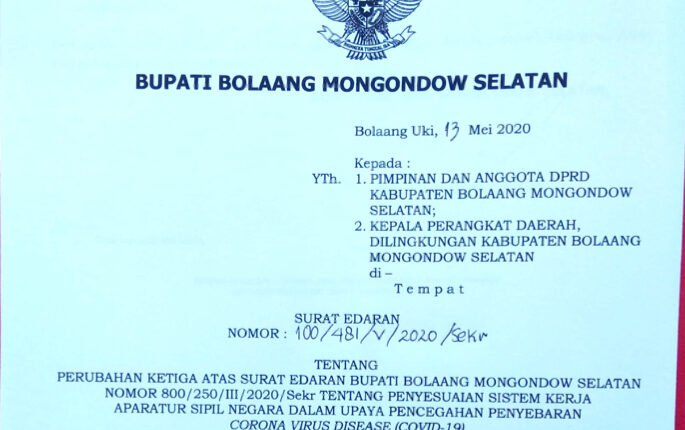 Sebagaimana yang tertuang dalam Surat Edaran nomor 100/481/V/2020/Sekr tentang perubahan ketiga atas Surat Edaran Bupati Bolaang Mongondow Selatan nomor 800/250/III/2020/Sekr tentang penyesuaian sistem kerja bagi ASN Pemerintah Bolaang Mongondow selatan dalam upaya pencegahan penyebaran Covid-19 Dalam surat edaran yang ditandatangani Bupati Bolsel Hi.Iskandar Kamarau tertanggal 13 Mei 2020 itu, menyebutkan bahwa pengaturan sistem kerja ASN dilingkungan Pemkab Bolsel diperpanjang hingga 29 Mei 2020 dan akan dievaluasi lebih lanjut sesuai dengan kebutuhan.