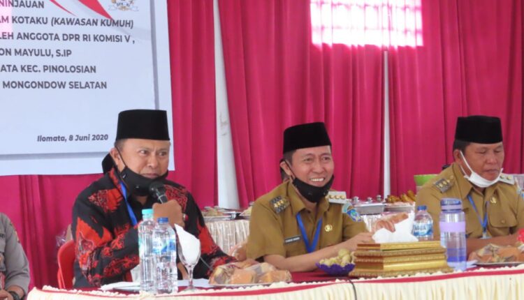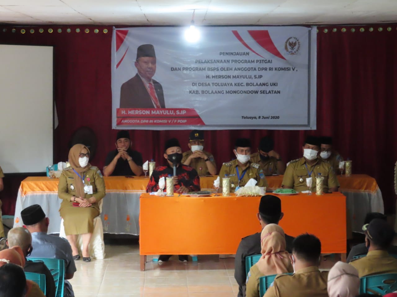 BOLSEL- Bupati Bolaang Mongondow Selatan ( Bolsel )  Hi. Iskandar Kamaru, bersama Wabub Deddy Abdul Hamid menghadiri Kunker Anggota DPR RI Hi. Herson Mayulu, dalam rangka peninjauan Program Kotaku dan BSPS di Desa Ilomata Kec. Pinolosian Senin (8/06/2020) Dilanjutkan dengan Peninjauan BSPS desa Molibagu dan Program P3TGAI Desa Toluaya Kec Bolaang Uki yg dilaksanakan di Balai Desa Toluaya, dalam kesempatan tersebut Bupati Bolsel Iskandar Kamaru Menyapaikan Atas nama Pemerintah Dan Masyarakat Mengucapkan banyak terimah kasih kepada Anggota DPR RI, Herson Mayulu, yang terus memberikan bantuan bagi warga Sulawesi Utara secara umum di Kabupaten Bolsel secara khusus, terus direalisasikan seperti bantuan 600 Unit BSPS Dan Bantuan Kolompok Tani (B3TGAI) Sebesar 195 Jt
