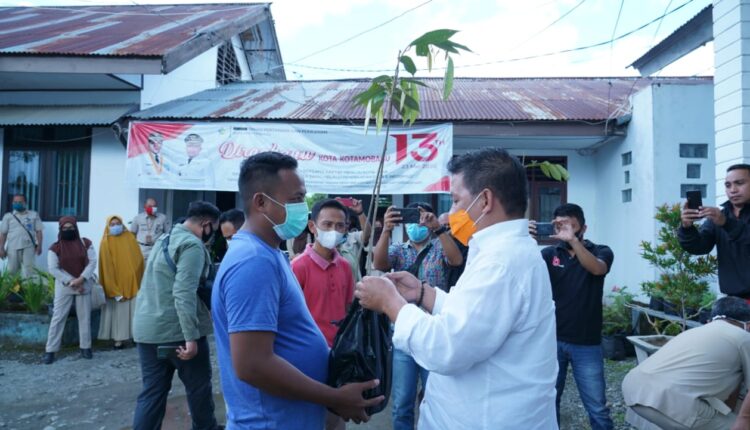 KOTAMOBAGU- Wakil Wali Kota Kotamobagu, Nayodo Koerniawan menyalurkan bantuan bibit tanaman durian jenis musang king kepada 4 Kelompok Tani, Senin (15/6/2020). Masing-masing kelompok tani di Desa Poyowa Besar, Kelurahan Motoboi Besar, Kelurahan Molinow dan Motoboi Kecil.
