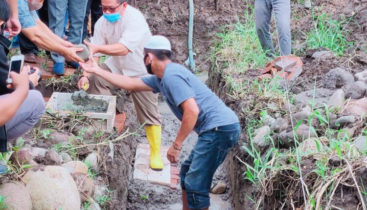 KOTAMOBAGU- Wakil Walikota Kotamobagu, Nayodo Koerniawan, meletakan batu pertama Masjid Hasan Usman di Perumahan Puri Citra Indah Motoboi Kecil. Jumat (26/06/2020).