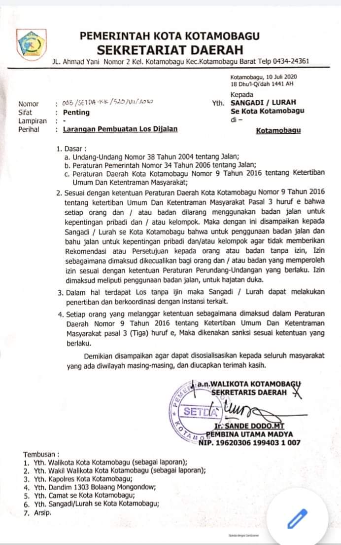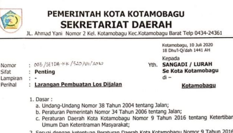 Dalam surat yang ditanda tangani oleh Sekretaris Daerah (Sekda) Kotamobagu tersebut menyebutkan, lurah dan sangadi dilarang memberikan rekomendasi kepada masyarakat Kota Kotamobagu, yang akan menggunakan badan jalan untuk kepentingan pribadi atau kelompok.