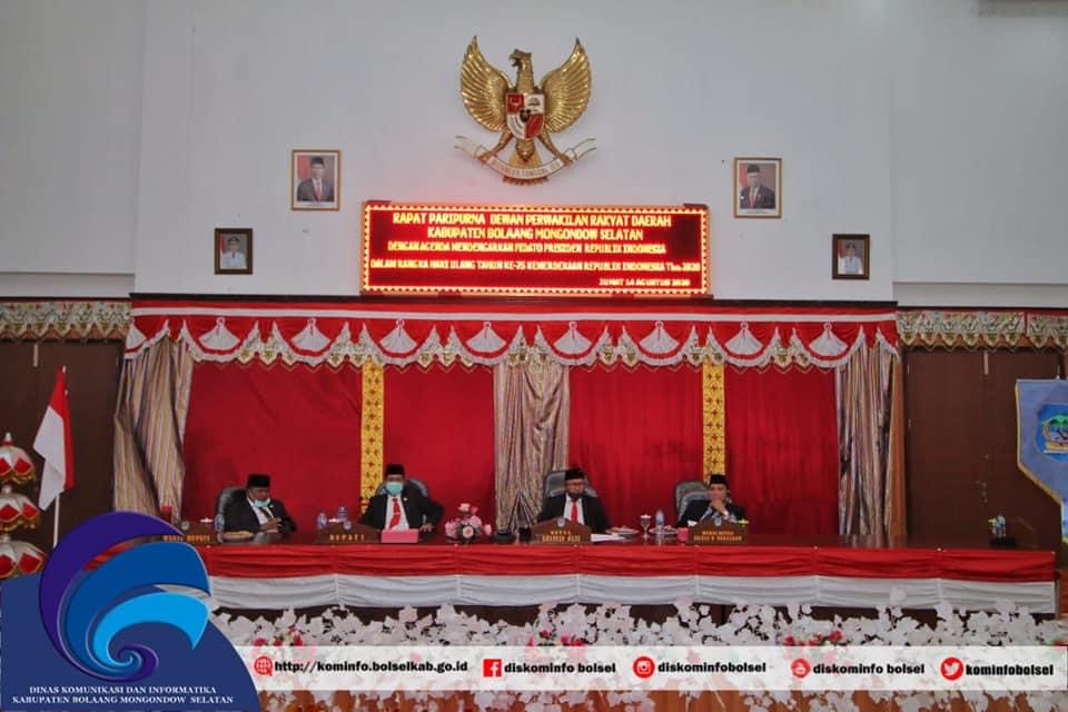 BOLSEL- Bertempat di-Ruang Sidang Paripurna DPRD Kab. Bolaang Mongondow Selatan, Bupati Bolsel Hi.Iskandar Kamaru, didampingi Wabup Bolsel Deddy Abdul Hamid menghadiri sekaligus mendengarkan pidato kenegaraan Presiden RI bersama Pimpinan dan Anggota DPRD Kab. Bolsel dalam rangka Hari Ulang Tahun (HUT) ke-75 Kemerdekaan Republik Indonesia Tahun 2020 pada sidang bersama DPR-RI dan DPD-RI, Sidang Tahunan MPR-RI dan Penyampaian