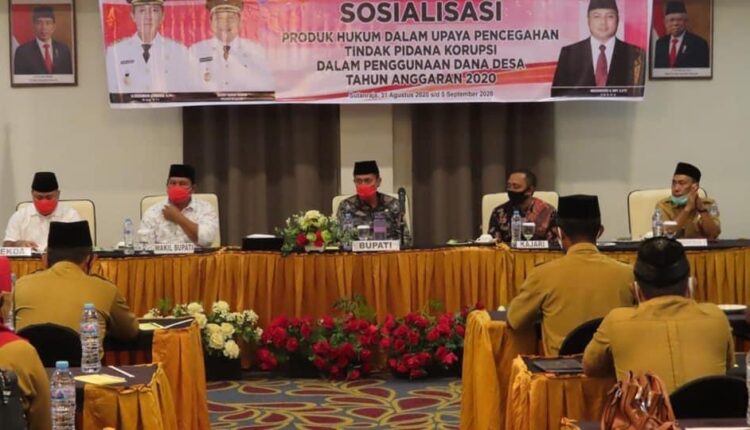 BOLSEL- Bupati Bolaang Mongondow Selatan (Bolsel)Hi.Iskandar Kamaru bersama Wakil Bupati Deddy Abdul Hamid didampingi Sekda Marzanzius A. Ohy, S.STP menghadiri sekaligus membuka kegiatan Sosialisai Produk Hukum dalam Upaya Pencegahan Tindak Pidana Korupsi dalam penggunaan Dana Desa oleh Kejaksaan Negeri Kotamobagu bertempat di Sutan Raja Hotel Kota Kotamobagu (31/8/2020).