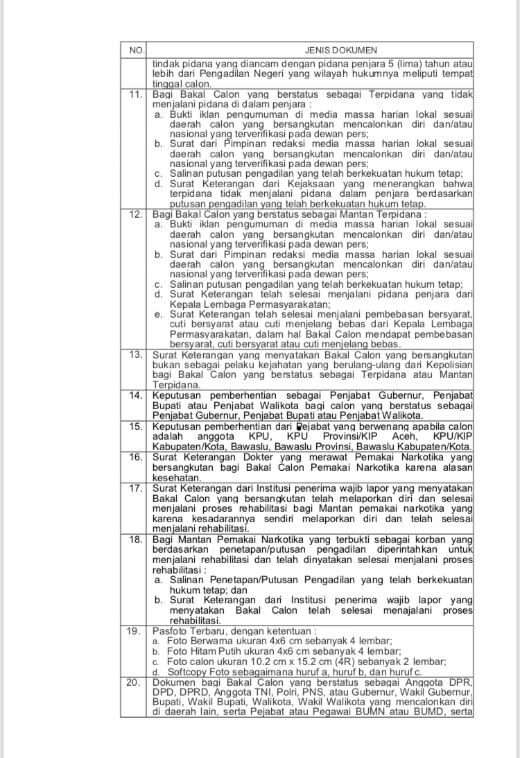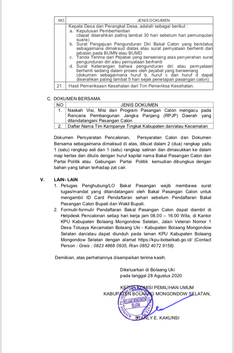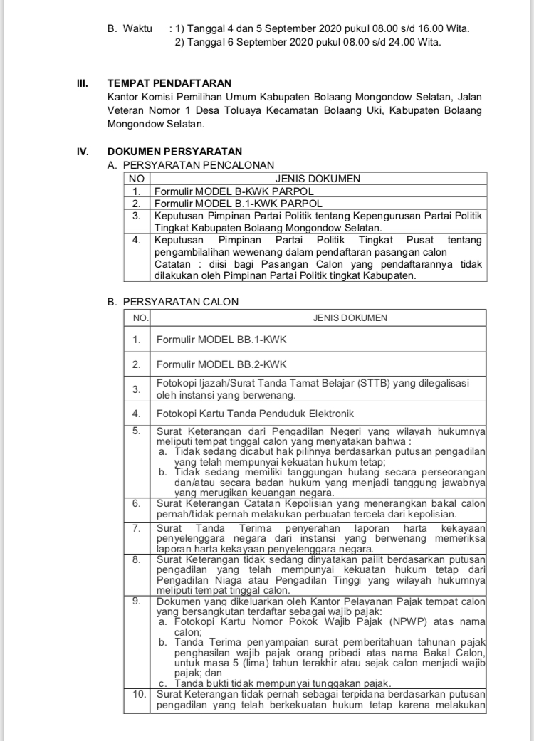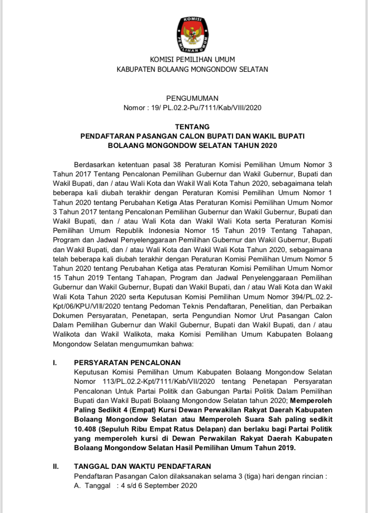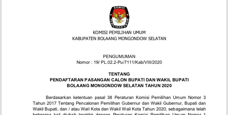 Berikut Pengumuman No:19/PL.02.2.pu/7111/KPU/Kab/V111/2020 tentang pendaftaran calon Bupati dan Wakil Bupati Kabupaten Bolsel tahun 2020:
