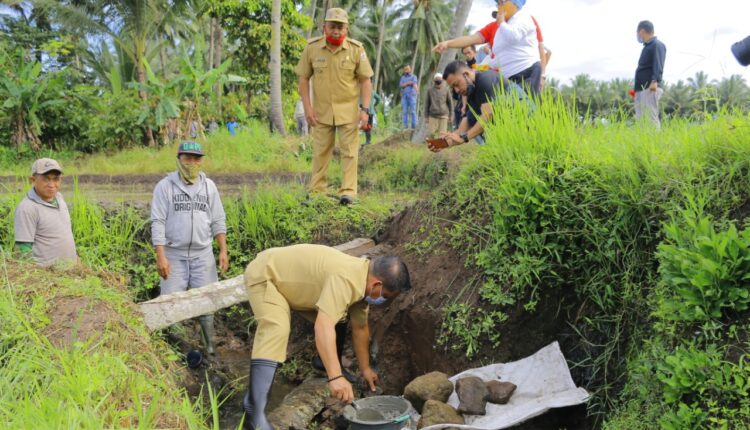KOTAMOBAGU- Wakil Walikota Nayodo Koerniawan, melakukan peletakan batu pertama pembuatan saluran air irigasi di Kelurahan Kobo Kecil. Selasa 15 agustus 2020.