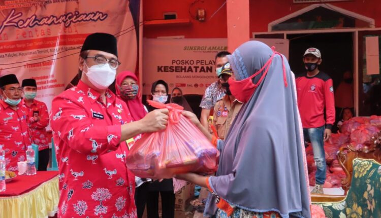 Dalam kesempatan tersebut Pjs Bupati Bolsel juga turut memberikan bantuan sembako kepada warga yang terdampak korban banjir bandang serta berkunjung ke rumah sementara di Posko pengungsian ,