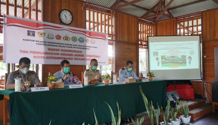 KOTAMOBAGU –Mewakili Wali Kota Tatong Bara, Asisten I Setda Kotamobagu, Teddy Makalalag, menghadiri sekaligus membuka kegiatan rapat koordinasi (Rakor) Tim Pengawasan Orang Asing (TIMPORA) yang digelar Kantor Imigrasi Kelas II Non TPI Kotamobagu Kementerian Hukum dan HAM, bertempat di Restoran Pondok Telaga, Senin 12 Oktober 2020