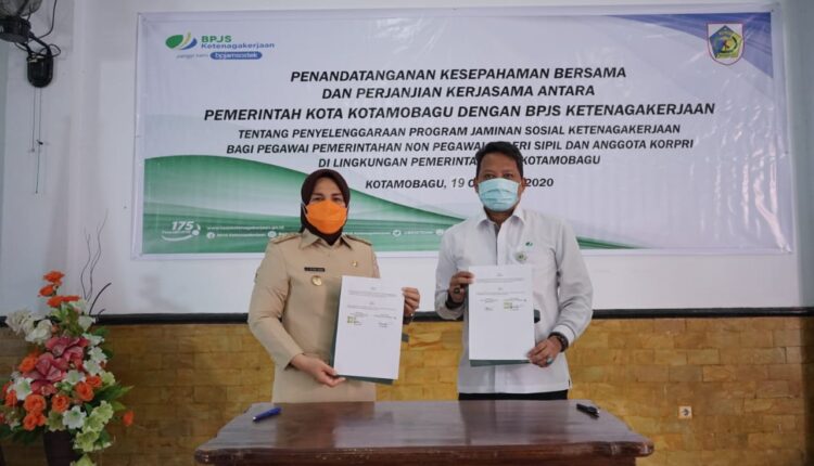 KOTAMOBAGU- Pemerintah Kota Kotamobagu bersama Badan Penyelenggara Jaminan Sosial (BPJS) melakukan penandatanganan kesepahaman dan kerja sama tentang penyelenggaraan program jaminan sosial ketenangakerjaan bagi pegawai pemerintahan non pegawai negeri sipil dan korpri, di Rudis Wali Kota, Senin 19 Oktober 2020