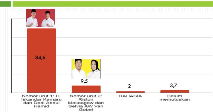 Dengan menggunakan asumsi publik 323 responden asli, maka pasangan nomor urut 1 Calon Bupati Bolsel Iskandar Kamaru unggul 84,8 persen. Untuk pasangan nomor urut 2 memperoleh 9,6 persen. Sementara yang belum menyatakan dukungan 3,4 persen dan masih rahasia 1,9 persen.