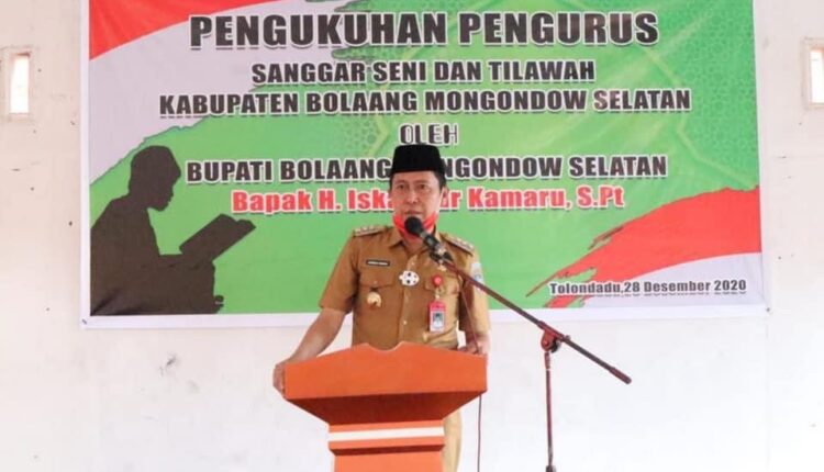 BOLSEL- Bupati Bolaang Mongondow Selatan (Bolse) Hi. Iskandar Kamaru,menghadiri acara Pengukuhan sekaligus mengukuhkan Pengurus Sanggar Seni dan Tilawah Kabupaten Bolaang Mongondow Selatan Senin 28 Desember 2020.
