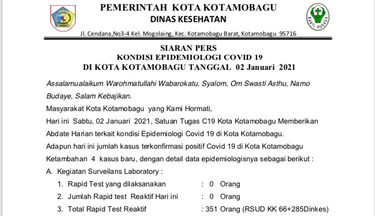 Dimana, dari siaran pers tersebut diketahui, pada Sabtu 2 Januari 202 terdapat 4 orang warga Kotamobagu yang terkonfirmasi positif COVID-19 setelah melalui proses swab test.