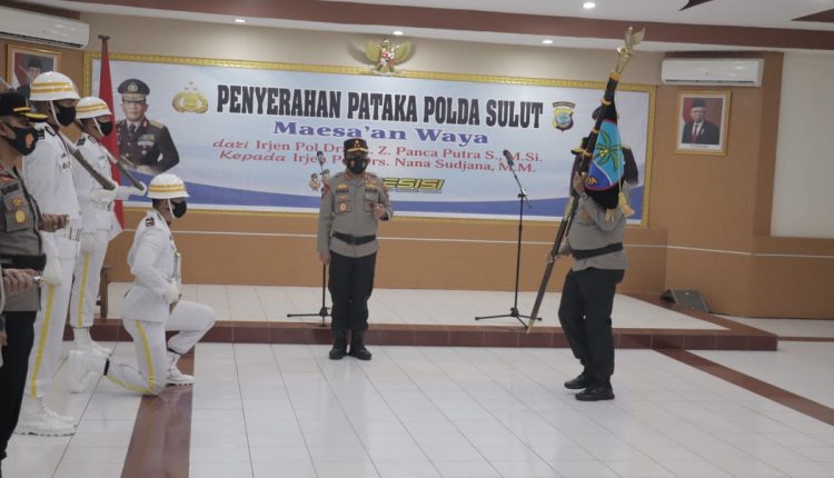 MANADO – Kapolda Sulawesi Utara Irjen Pol Nana Sudjana menerima Pataka Polda Sulut ‘Maesa’an Waya’ dari irjen Pol RZ Panca Putra.