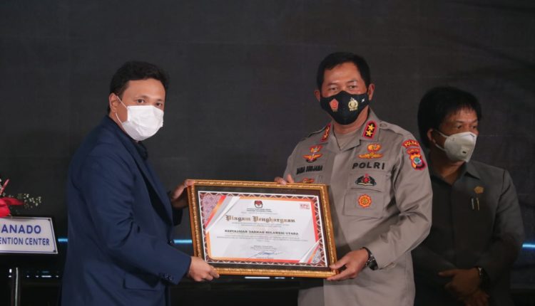 Piagam penghargaan diserahkan langsung oleh Ketua KPU Provinsi Sulut, Ardiles Mewoh kepada Kapolda Sulut, Irjen Pol Nana Sudjana, Selasa (20/04/2021) sore, di Grand Kawanua Convention Center Manado.