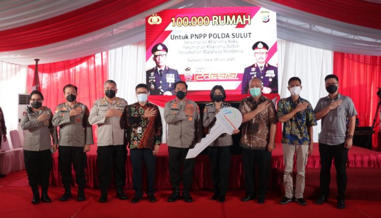 INDO NEWS – Polri melaksanakan launching 100 ribu rumah untuk Pegawai Negeri Pada Polri (PNPP), yang digelar serentak di 28 Polda se-Indonesia.Launching ini dipusatkan di Provinsi Banten, dipimpin langsung oleh Kapolri Jenderal Polisi Listyo Sigit Prabowo, Jumat (4/6/2021) dan diikuti secara virtual oleh Polda-Polda di Indonesia.Dalam sambutannya, Kapolri menyampaikan terima kasih kepada semua pihak atas kerja samanya, serta kerja keras seluruh Kepala Kesatuan.”Salah satu kebutuhan mendasar adalah masalah papan atau rumah, dan itu menjadi salah satu program Polri untuk memenuhi kebutuhan tesebut,” ujar Kapolri.Dengan pembangunan perumahan bagi personel Polri ini, juga katanya dapat memutar dan menghidupkan ekonomi sekitar karena adanya pembangunan. “Ini upaya kami (Polri) untuk meningkatkan kesejahteraan bagi anggota kami,” ujar Jenderal Sigit.Launching ditandai dengan penandatanganan dan penekanan tombol oleh Kapolri, dilanjutkan dengan penyerahan secara simbolis kunci rumah kepada perwakilan PNPP.Launching 100 ribu rumah ini juga diikuti oleh Polda Sulut, yang dilaksanakan di salah satu lokasi perumahan di Desa Koka Kecamatan Tombulu Kabupaten Minahasa.Launching diikuti secara virtual, dihadiri oleh Wakapolda Sulut Brigjen Pol Rudi Darmoko, para PJU Polda, pihak Pengembang dan Perbankan.”Hari ini Polda Sulut barusan mengikuti launching 100 ribu rumah yang dipimpin oleh Kapolri. Dan di Sulut kita sudah siapkan sekitar 350 unit untuk anggota Polda Sulut yang tersebar di wilayah Minahasa, Boltim dan Sangihe. Ini kita lakukan secara bertahap bekerja sama dengan pengembang dan perbankan,” ujar Brigjen Pol Rudi Darmoko.Wakapolda berharap semoga kualitas dari rumah yang dibangun ini layak dihuni. “Rumah yang dibangun diharapkan layak huni. Jangan kualitas rendah sehingga anggota Polri yang menempati sudah cepat rusak,” tandasnya. (Gito Mokoagow)