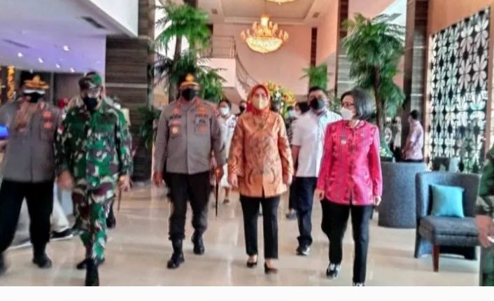 KOTAMOBAGU -Wali Kota Kotamobagu, Tatong Bara didampingi Bupati Bolaang Mongondow (Bolmong), Yasti Soepredjo Mokoagow bersama Forum Koordinasi Pimpinan Daerah (Forkompimda) menyambut kunjungan Pangdam XIII/Merdeka, Mayjen TNI Santos G. Matondang dan Kapolda Sulut, Irjen Pol Nana Sudjana, Kamis 17Juni 2021