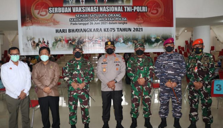 Peninjauan kegiatan Serbuan Vaksinasi Nasional TNI-Polri dalam rangka Hari Bhayangkara ke-75 ini, juga dihadiri oleh Forkopimda Sulut, diantaranya, Pangdam XIII/Merdeka Mayjej TNI Santos G. Matondang, Danlantamal Manado, Ketua DPRD Provinsi, juga dihadiri Ketua Bhayangkari Sulut Ny. Shinta Nana Sudjana, Wakapolda Sulut Brigjen Pol Rudi Darmoko dan para PJU Polda Sulut.(Gito Mokoagow)