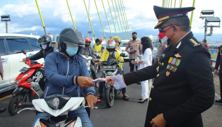 Kegiatan dilanjutkan dengan pembagian masker gratis kepada para pengguna jalan yang melintas di Jembatan Soekarno, oleh Personel Polri bersama Komunitas Wartawan.