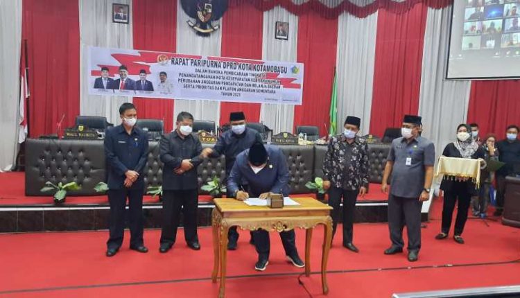 KOTAMOBAGU – Dewan Perwakilan Rakyat Daerah (DPRD) Kota Kotamobagu mengelar rapat paripurna dalam rangka pembicaraan tingkat II penandatanganan nota kesepakatan Kebijakan Umum Perubahan Anggaran Pendapatan dan Belanja Daerah Serta Prioritas dan Plafon Anggaran Sementara Tahun 2021, Selasa 21 September 2021