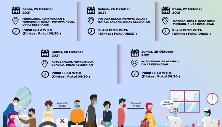 KOTAMOBAGU – Giat vaksinasi bagi masyarakat Kotamobagu terus berlangsung. Senin hari ini, 25 Oktober 2021, giat vaksinasi dilaksanakan di Mogolaing, Mongkonai Barat, Kopandakan 1, Poyowa Kecil dan Dinkes Kotamobagu.