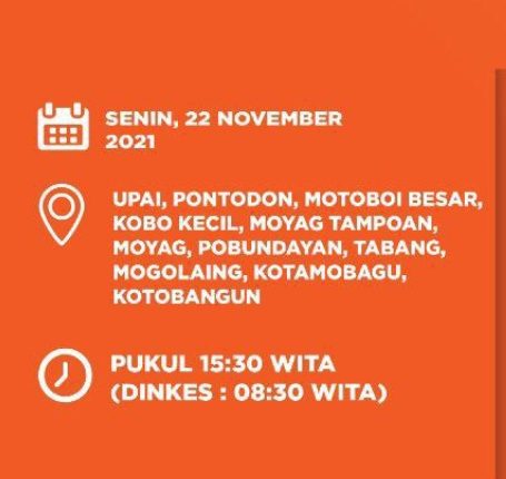 Sedangkan untuk jadwal pelaksanaan vaksinasi itu  dimulai pukul 08: 30 Wita di Kantor Dinkes Kotamobagu Sementara di kelurahan Upai, Pontodon, Motoboi Besar, Kobo Kecil, moyag Tampoan, Moyag,Pobundayan,Tabang, Mogolaing, Kotamobagu, Kotobangon dimulai pukul 15: 30 Wita sampai selesai.(*)