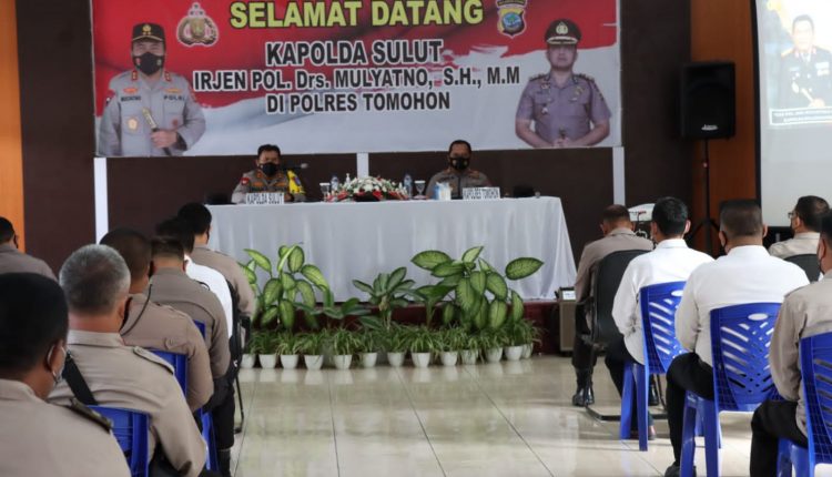 Selanjutnya Kapolda Sulut Irjen Pol Mulyatno memberikan arahan dan bimbingan kepada seluruh Perwira dan perwakilan Bintara Polres Tomohon dan jajaran, di aula Parama Satwika.