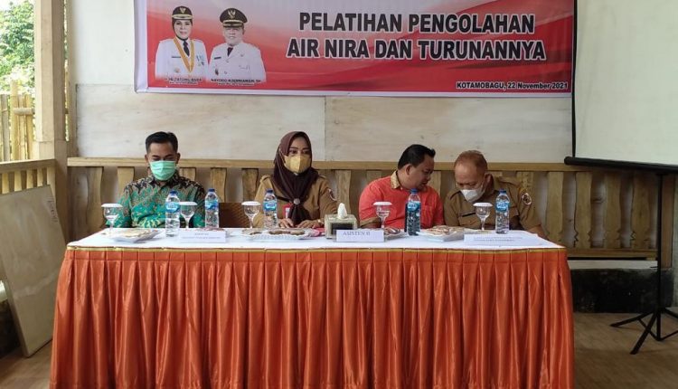 KOTAMOBAGU —Dinas Perindustrian dan Tenaga Kerja Kota Kotamobagu, menggelar pelatihan Pengolahan Air Nira dan Turunannya bagi 25 petani gula aren, Senin 22 November 2021