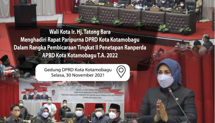 KOTAMOBAGU – Wali Kota Kotamobagu Ir Hi Tatong Bara, menghadiri rapat paripuna dalam rangka pembicaraan tingkat II penetapan Rancangan Peraturan Daerah tentang Anggaran Pendapatan dan Belanja Daerah Kota Kotamobagu tahun anggaran 2022 yang dilaksanakan oleh Dewan Perwakilan Rakyat Daerah (DPRD) Kota Kotamobagu,Selasa 30 November 2021