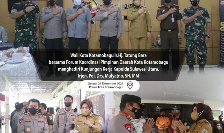 KOTAMOBAGU – Wali Kota Kotamobagu, Ir Tatong Bara bersama Kapolres Kotamobagu AKBP Irham Halid, SIK beserta unsur Forum Koordinasi Pimpinan Daerah (Forkopimda) Kota Kotamobagu menyambut kedatangan Kapolda Sulawesi Utara (Sulut) Irjen Pol Drs. Mulyatno, S.H, M.M, yang melakukan kunjungan kerja dan silaturahmi ke Kota Kotamobagu di Markas Kepolisian Resor (Mapolres) Kotamobagu, Selasa 21 Desember 2021