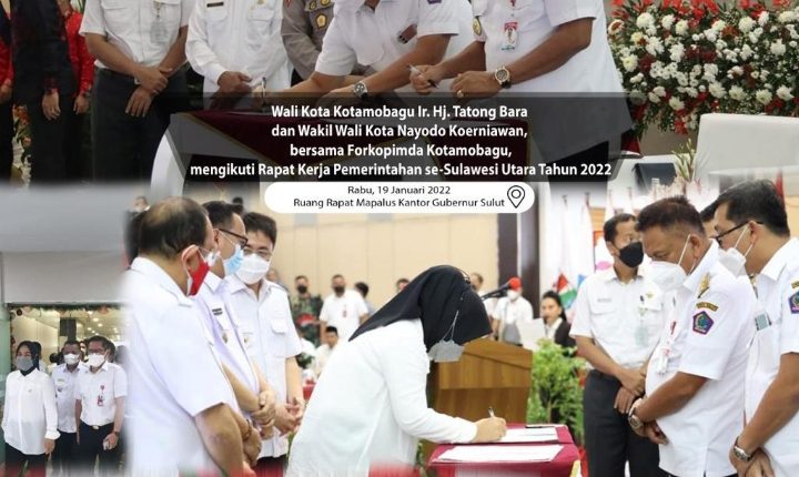 KOTAMOBAGU – Wali Kota Kotamobagu, Tatong Bara dan Wakil Wali Kota Nayodo Koerniawan bersama Forkopimda Kotamobagu mengikuti Rapat Kerja (Raker) Pemerintahan se-Sulawesi Utara (Sulut) 2022.