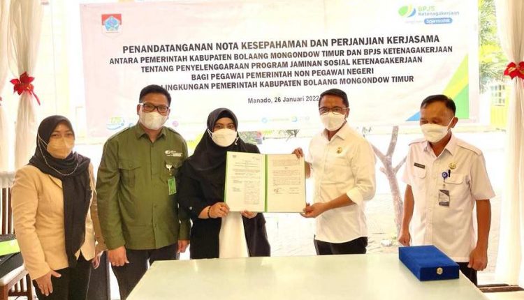BOLTIM – Bupati Bolaang Mongondow Timur (Boltim) Sam Sachrul Mamonto S Sos MSi, Rabu (26/01), menandatangani Nota Kesepahaman dan Perjanjian Kerjasama atau Memorandum of Understanding (MoU) antara Pemerintah Daerah Kabupaten Boltim dengan BPJS Ketenagakerjaan, tentang penyelenggaraan program Jaminan Sosial Ketenagakerjaan bagi Pegawai Pemerintah dan Non Pegawai Negeri Sipil (PNS).