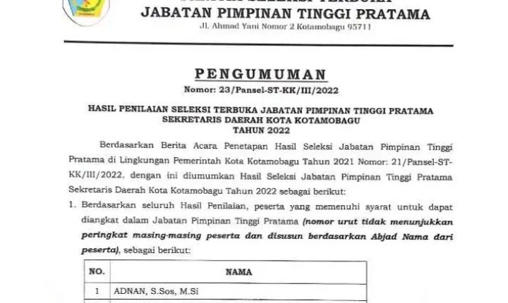 Hasil seleksi tersebut berdasarkan surat pengumuman nomor: 23/Pansel-ST-KK/III/2022, yang ditandatangani Ketua Pansel Sande Dodo, tanggal 14 Maret 2022 tentang Hasil Penilaian Seleksi Terbuka Jabatan Pimpinan Tinggi Pratama Sekretaris Daerah Kota Kotamobagu tahun 2022.