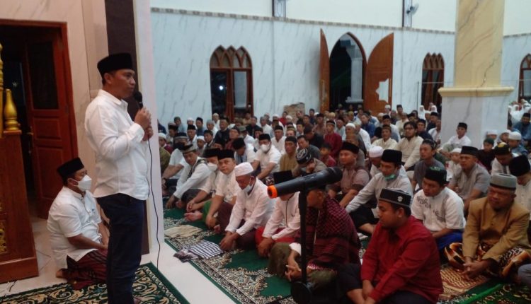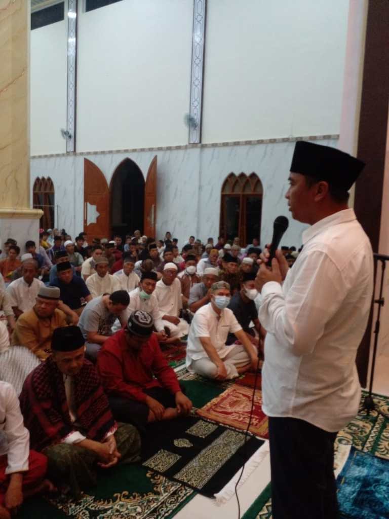 Bupati juga menyampaikan kepada kaum muslimin dalam bulan suci Ramadhan ini memperbanyak membaca ayat suci Al Qur’an. “Juga selalu memelihara shalat lima waktu dan memperbanyak sedekah dan perbuatan kebajikan lainya, termasuk mari kita ramaikan mesjid di bulan bulan puasa ini,” harap Bupati. Sembari, menambahkan, dimana ada hal positif yang kita ambil saat menjalankan ibadah puasa, dimana saat perut kita kosong tentu imun tubuh kita akan semakin kuat. Sekedar diketahui oada shokat tarwih berjamaah ini Bupati bersama rombongan dan seluruh jamaah tetap menggunakan protokol kesehatan.(bm)