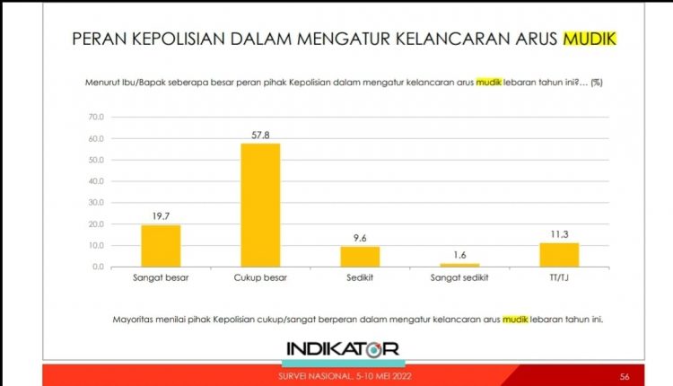 “Mayoritas menilai pihak kepolisian cukup atau sangat berperan dalam mengatur kelancaran arus mudik Lebaran tahun ini,” kata Direktur Eksekutif Indikator Politik Indonesia, Burhanuddin Muhtadi saat merilis hasil survei melalui virtual, Minggu (15/5/2022).