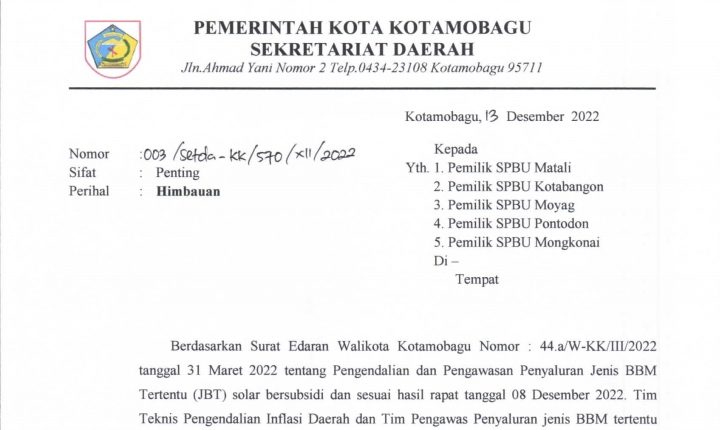 Surat imbauan dengan Nomor 003/Setda-KK/570/XII/2022 tersebut, merupakan tindaklanjut Surat Edaran (SE) Wali Kota Kotamobagu Nomor 44.a/W KK/III/2022 tanggal 31 Maret 2022 tentang Pengendalian dan Pengawasan Penyaluran Jenis BBM Tertentu (JBT) solar bersubsidi.