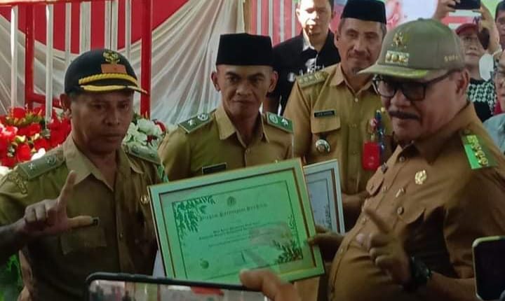 Dalam kegiatan tersebut Pj Bupati Limi Mokodompit menyerahkan sertifikat program kampung iklim serta bantuan bibit pohon.