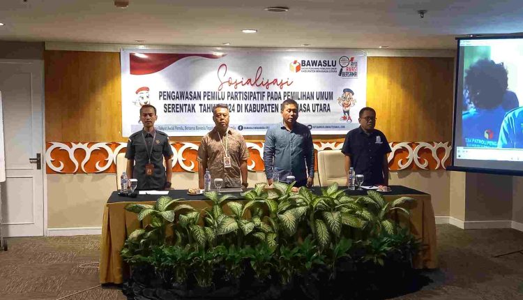 Sosialisasi Pengawasan Pemilu Partisipatif pada Pemilihan Umum Serentak Tahun 2024 di Kabupaten Minahasa Utara dibuka langsung oleh Ketua Bawaslu Minut Simon Awuy dengan menghadirkan narasumber Joko Mulyadi Akademisi Universitas Klabat dan Dikson Lahope mantan Komisioner KPU Minut.