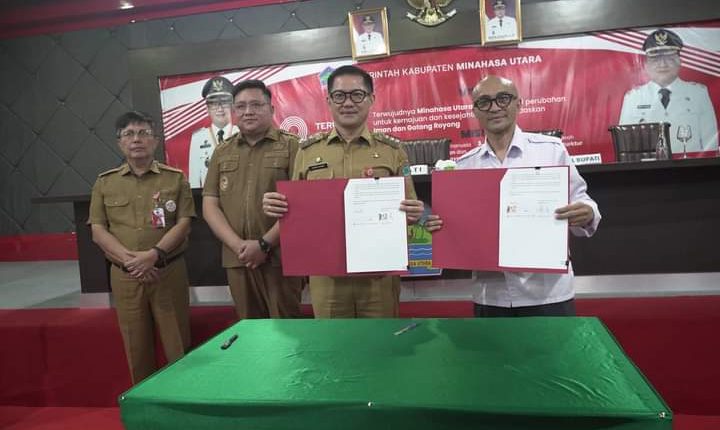 Penandatanganan dilakukan oleh Bupati Minut Joune Ganda bersama Ketua KPU Hendra Lumanauw dan Ketua Bawaslu Simon Awuy, di Aula Kantor Bupati Minut, Senin (24/07/23).