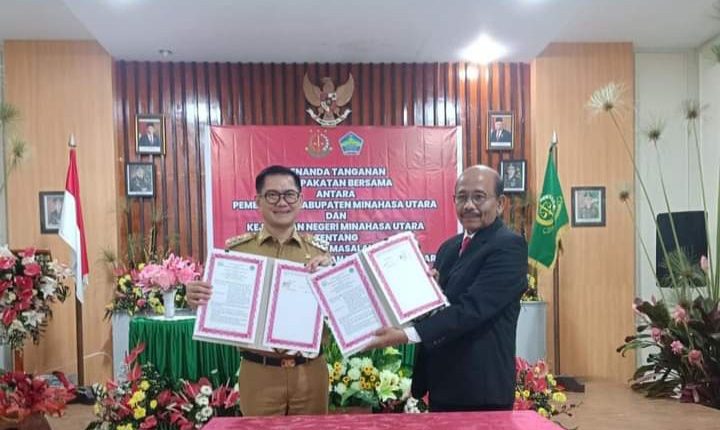 Kerjasama tersebut dituangkan dalam penandatanganan nota kesepakatan bersama (MoU) antara Bupati Joune Ganda dan Kepala Kejaksaan Negeri (Kajari) Minahasa Utara Yohanes Priyadi, di Aula Kantor Kejari Minut, Senin (24/07/23).