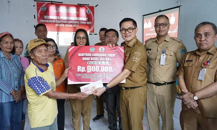 MINUT_Bupati Joune .Ganda menyerahkan secara simbolis Bantuan Langsung Tunai (BLT) Dana Desa tahap ke-2 tahun 2023 untuk 47 Keluarga Penerima Manfaat (KPM) di Desa Wusa Kecamatan Talawaan, Selasa (25/07/23).