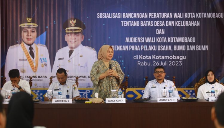 KOTAMOBAGU – Wali Kota Kotamobagu, Ir. Hj. Tatong Bara membuka kegiatan Sosialisasi Rancangan Peraturan Wali Kota (Ranperwa) tentang Batas Desa dan Kelurahan yang dirangkaikan dengan Audiensi dengan para pelaku usaha, pimpinan BUMN dan BUMD di Kota Kotamobagu, Rabu (26/7/2023).
