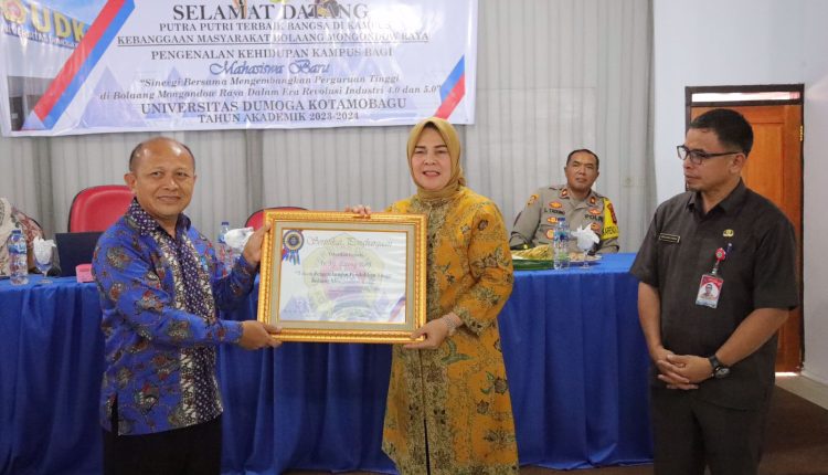 Penghargaan yang diserahkan langsung oleh Rektor UDK, Dr. Ir. Agus Supandi Soegoto, S.E., M.Si, kepada Wali Kota Kotamobagu tersebut dilaksanakan pada kegiatan Pengenalan Kehidupan Kampus Mahasiswa Baru (PKKMB) Universitas Dumoga Kotamobagu Tahun Akademik 2023/2024.