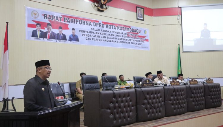 KOTAMOBAGU – Penjabat (Pj) Wali Kota Kotamobagu, Dr. Drs. H. Asripan Nani, M.Si., menyampaikan Kebijakan Umum Perubahan Anggaran Pendapatan dan Belanja Daerah serta Prioritas dan Plafon Anggaran Sementara Tahun Anggaran 2023, pada Rapat Paripurna DPRD Kota Kotamobagu, Selasa (27/9/2023).